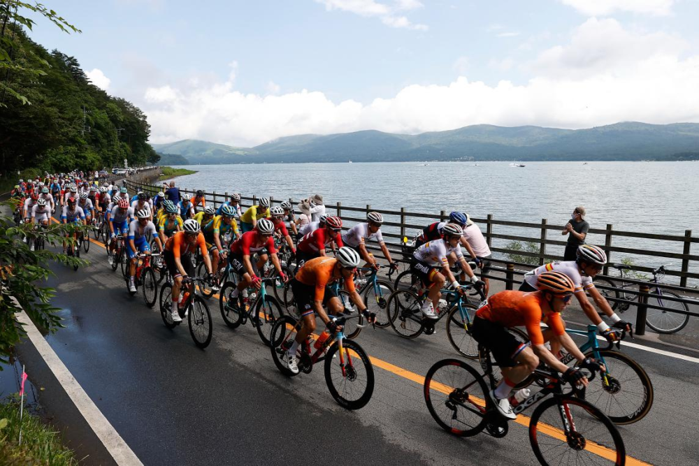 7月24日,运动员们在东京奥运会男子公路自行车比赛中经过山中湖。