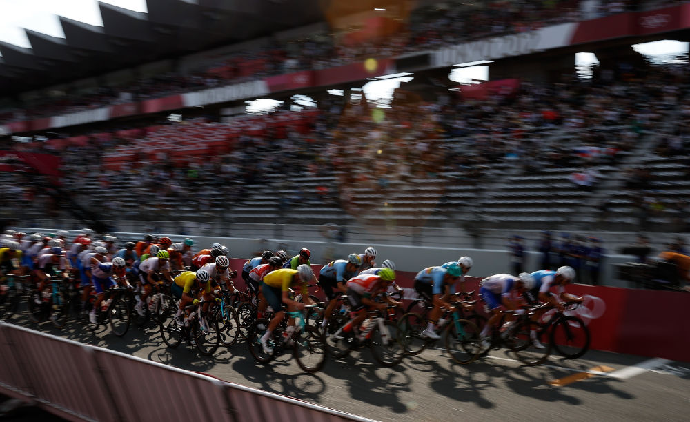 7月24日,选手们在比赛中。当日,在2020东京奥运会男子公路自行车比赛中,厄瓜多尔选手卡拉帕兹以6小时05分26秒的成绩夺冠。