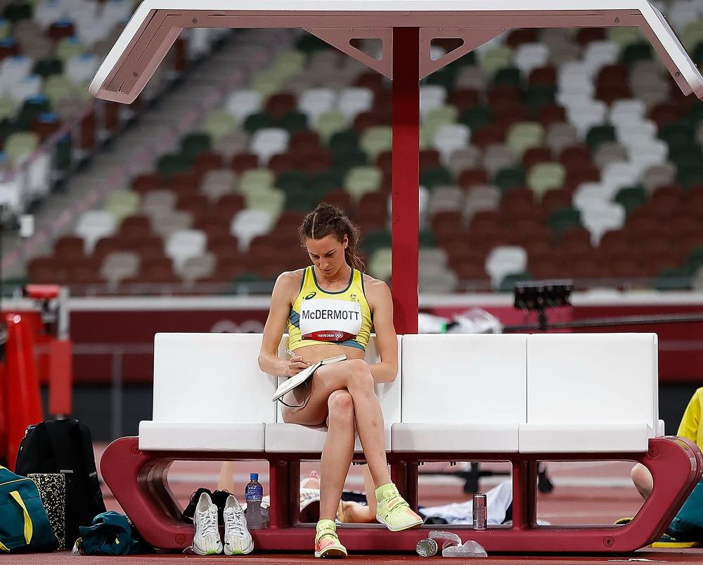 8月7日,澳大利亚选手麦狄蒙在女子跳高决赛中记笔记。