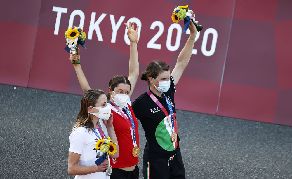 7月25日,冠军奥地利选手基森霍弗(中)、亚军荷兰选手范·弗勒滕(左)和季军意大利选手博尔吉尼在颁奖仪式上。当日,在东京奥运会自行车女子公路赛中,奥地利选手基森霍弗夺得冠军。