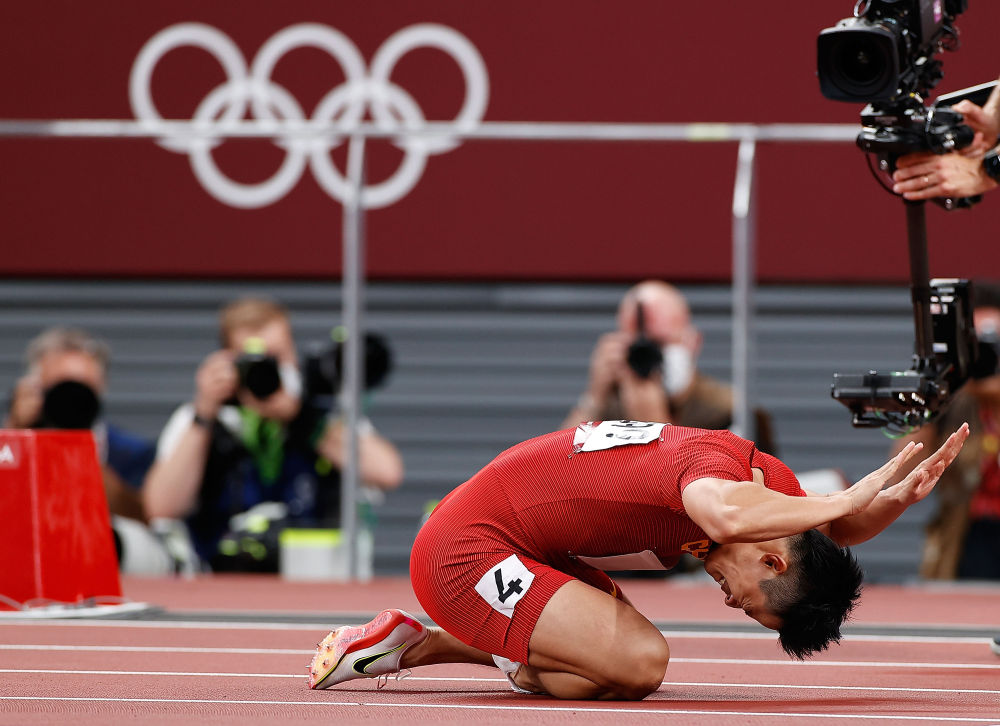 8月1日,苏炳添在比赛后庆祝。当日,东京奥运会田径男子100米半决赛在东京新国立竞技场举行。