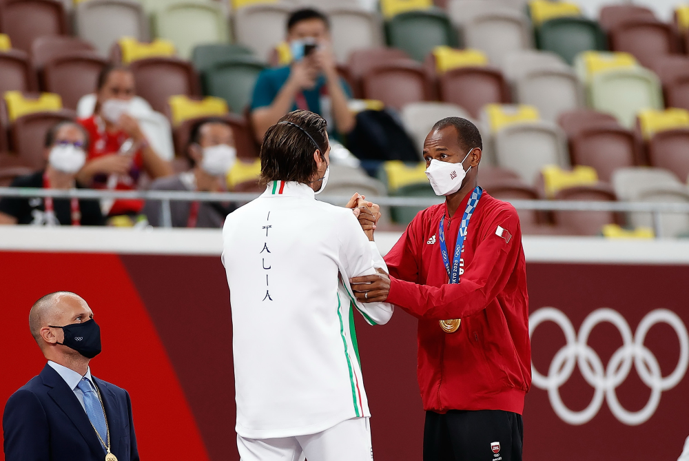 8月2日,同获男子跳高金牌的意大利选手坦贝里(左)和卡塔尔选手巴希姆在颁奖仪式上。