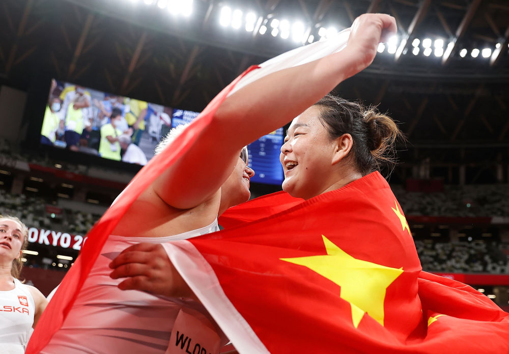 8月3日,中国选手王峥(右)在田径项目女子链球决赛后与对手相拥庆祝。当日,中国选手王峥在东京奥运会女子链球决赛中获得银牌。