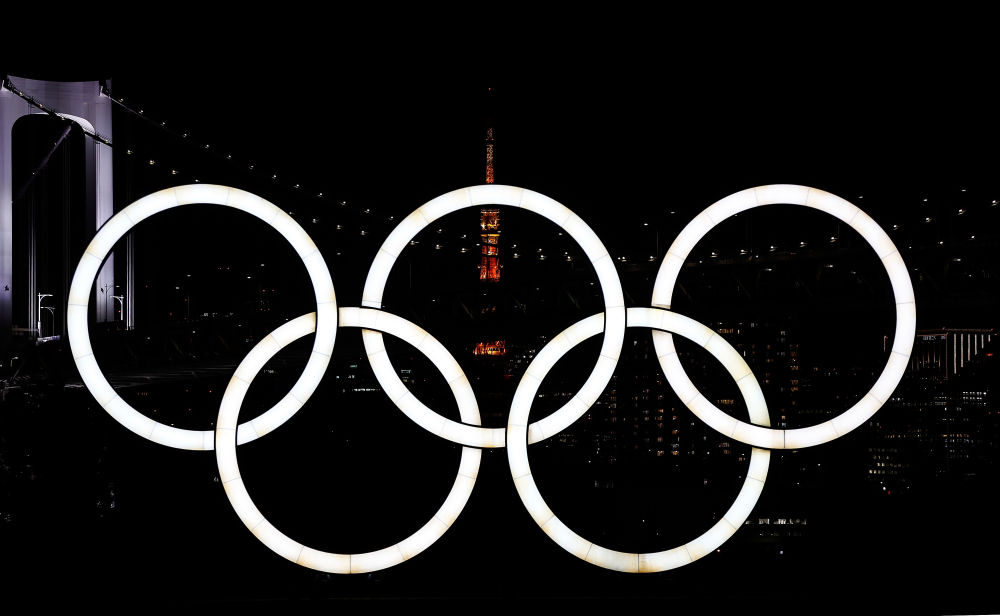 7月21日,位于东京湾的奥运五环标志被点亮。