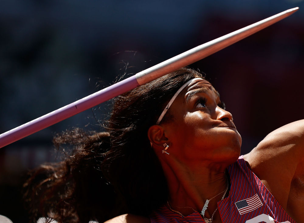 8月5日,美国选手布加尔在女子七项全能标枪比赛中。当日,东京奥运会田径比赛继续在东京新国立竞技场举行。