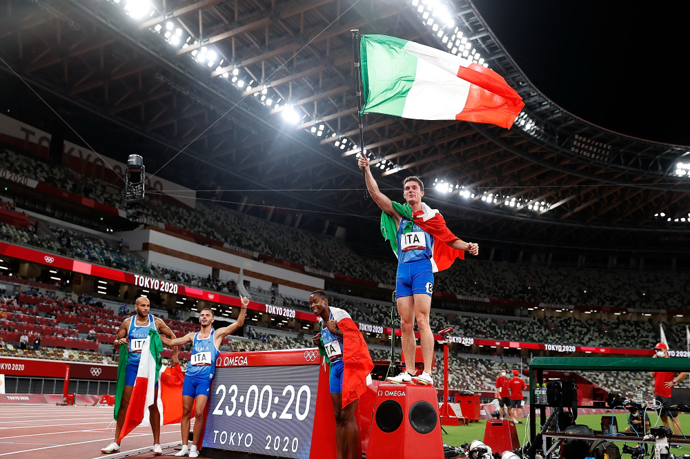 8月7日,意大利队在男子4x100米接力决赛后庆祝。当日,东京奥运会田径比赛继续在东京新国立竞技场举行。