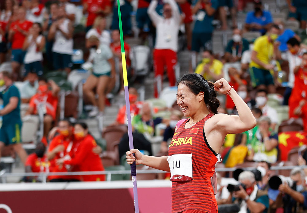 8月6日,刘诗颖庆祝胜利。当日,在东京奥运会田径女子标枪决赛中,中国选手刘诗颖夺得冠军。