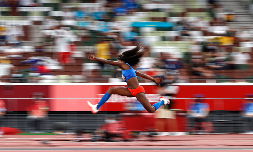 7月30日,哥伦比亚选手伊瓦尔根在东京奥运会女子三级跳远资格赛中。
