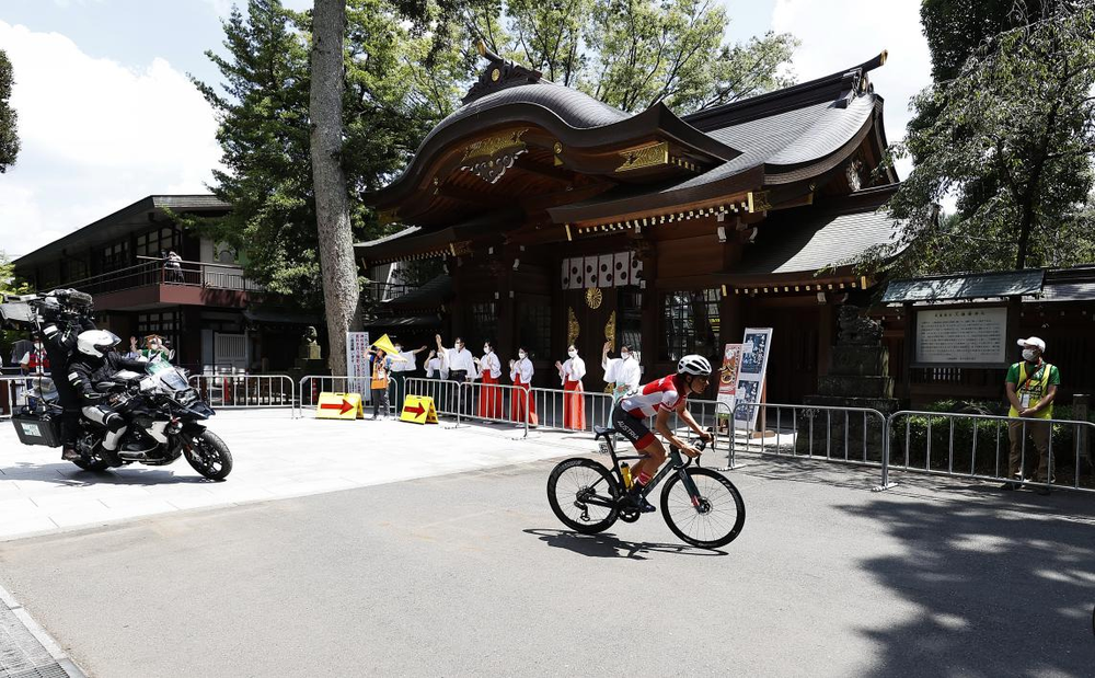 第二天女子赛,我在神社蹲守,除了拍到选手们经过神社的常规画面,竟然也还捕捉到了本届奥运会最大的黑马之一、仅把自行车作为爱好、没有团队没有教练独自训练最终孤勇夺冠的奥地利数学博士后安娜·基森霍弗一个人经过神社的画面,要知道那一刻她并未领先。