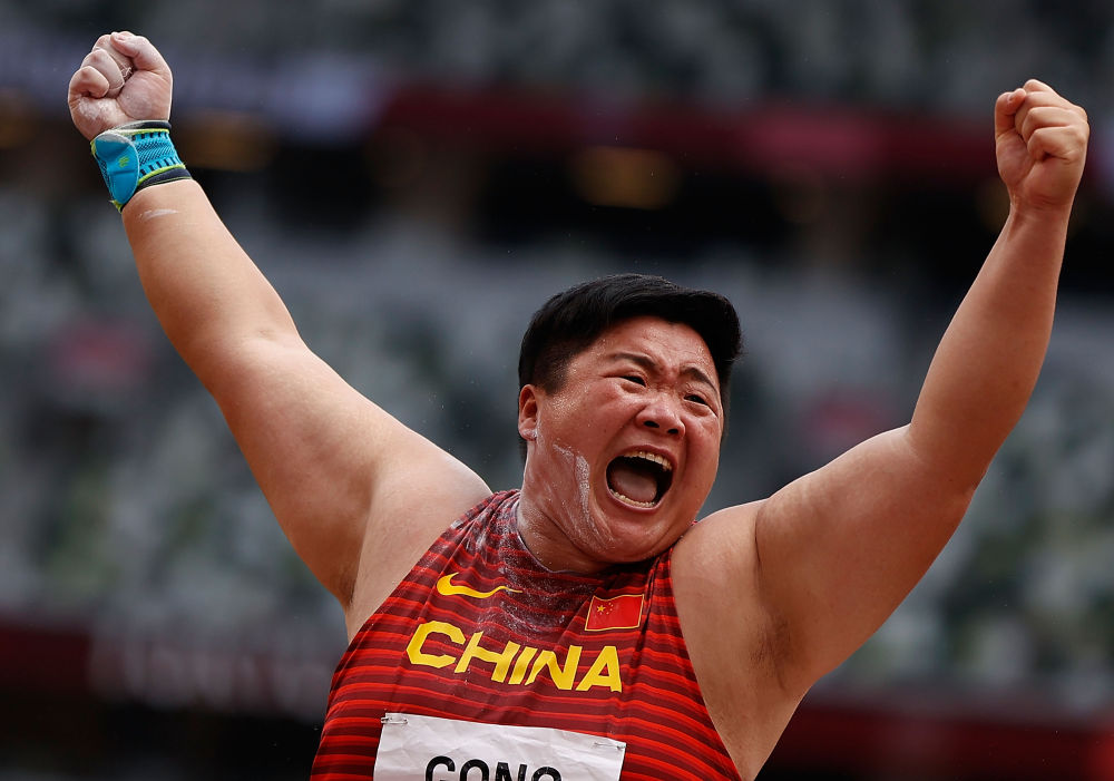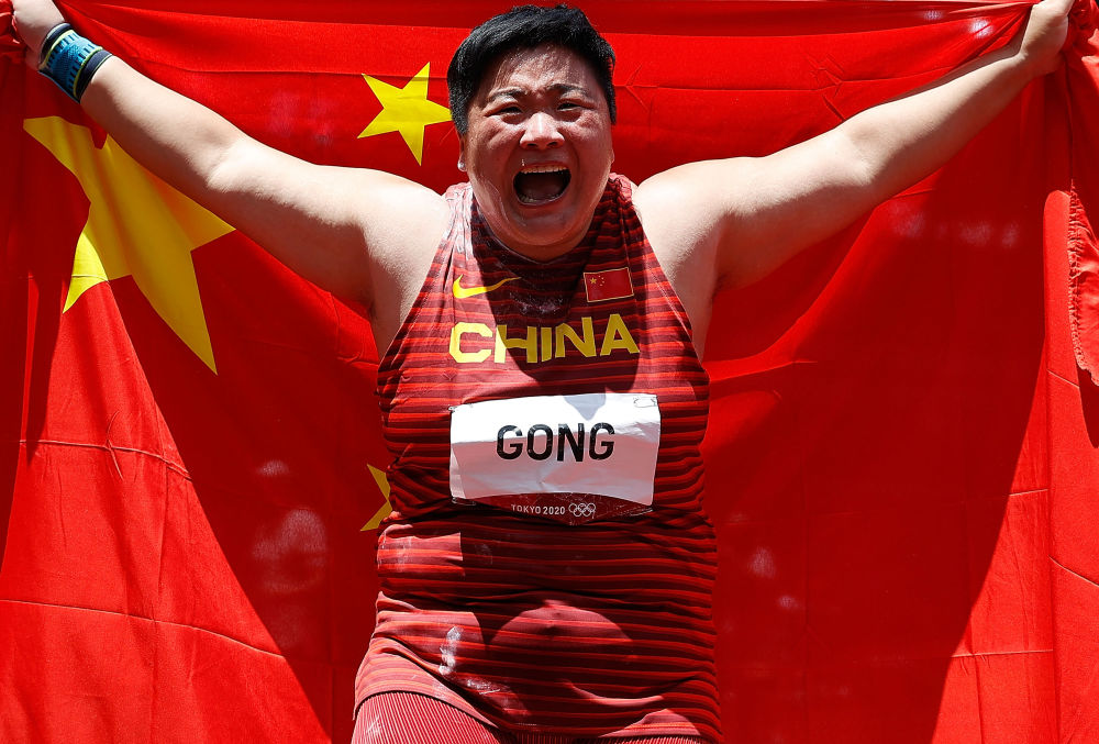 8月1日,巩立姣在比赛中。当日,在东京奥运会田径女子铅球决赛中,中国选手巩立姣夺得冠军。