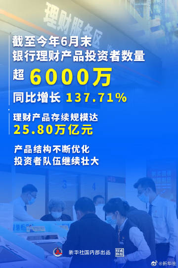 【#权威快报#|#银行理财产品投资者数量超6000万#】银行理财产品是不少人打理自己“钱袋子”的重要选择。银行业理财登记托管中心13日发布的报告显示,截至今年6月末,持有理财产品的投资者数量达6137.73万个,同比增长137.71%。其中个人投资者6114.09万人,较年初增加1965.99万人。上半年,理财产品累计