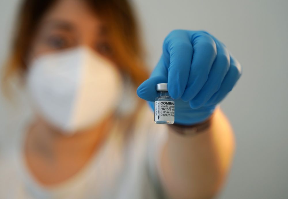 7月21日,在意大利罗马一处新冠疫苗接种中心,医务人员展示新冠疫苗。(新华社记者金马梦妮摄)