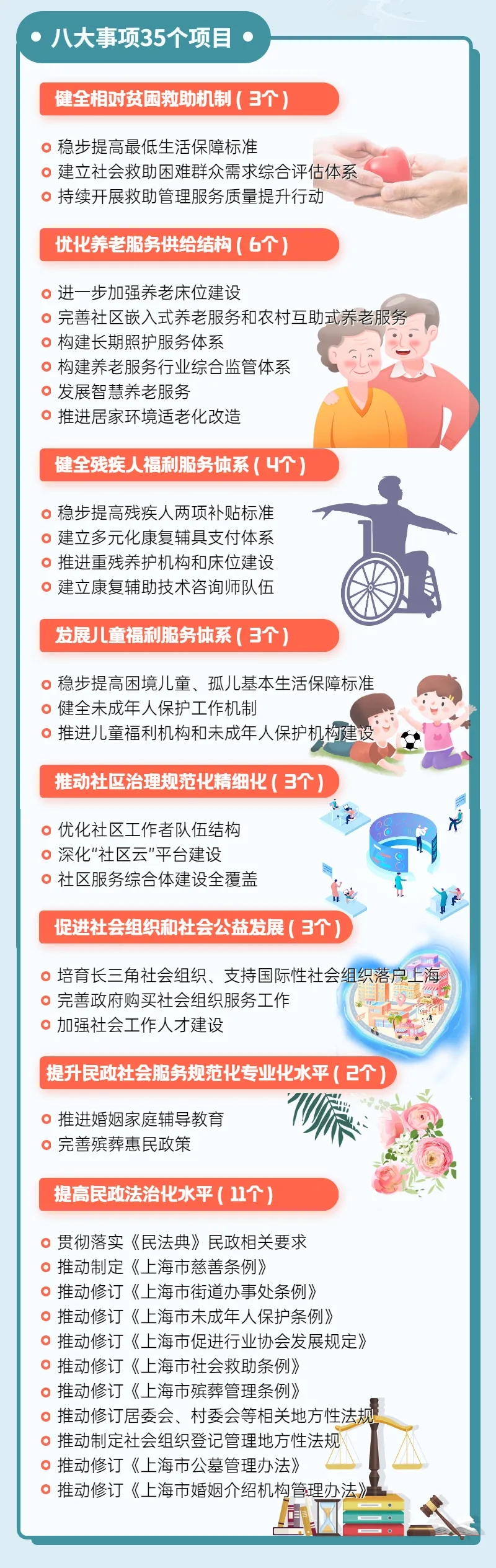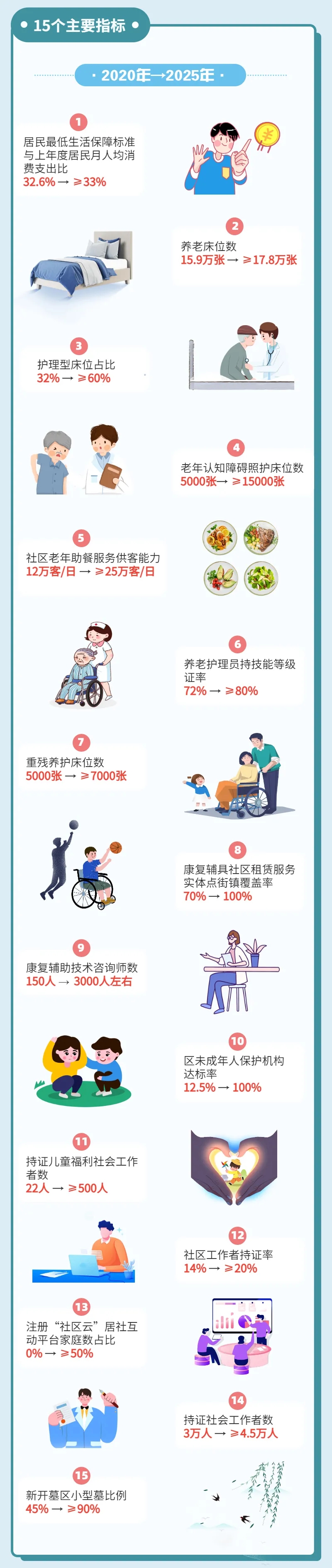 8月13日,上海市政府举行新闻发布会,介绍《上海市民政事业发展“十四五”规划》的主要内容。记者从发布会上获悉,“十四五”时期,上海养老服务供给结构进一步优化,到“十四五”末,养老床位总量将达到17.8万张。其中,重点发展护理型床位和认知障碍照护床位,使护理型床位不低于总床位的60%,认知障碍照护床位从5000张增加到1.5万张。全市街镇(乡)社区综合为老服务中心达到500家左右,社区养老服务设施达到每千人建筑面积40平方米,老年认知障碍友好社区建设实现街镇(乡)全覆盖。基本形成15分钟服务圈,还将通过市场化运作和政府资助相结合的方式,完成2.5万户适老化改造。
