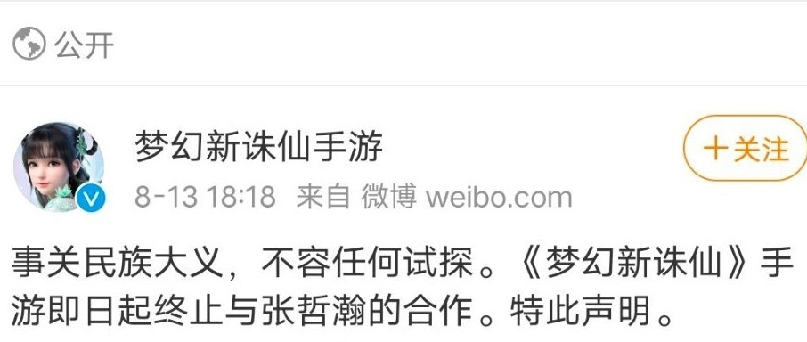 @梦幻新诛仙手游 声明:事关民族大义,不容任何试探。《梦幻新诛仙》手游即日起终止与张哲瀚的合作。特此声明。