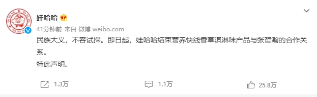 13日傍晚,@娃哈哈 发布声明称,民族大义,不容试探。即日起,娃哈哈结束营养快线香草淇淋味产品与张哲瀚的合作关系。