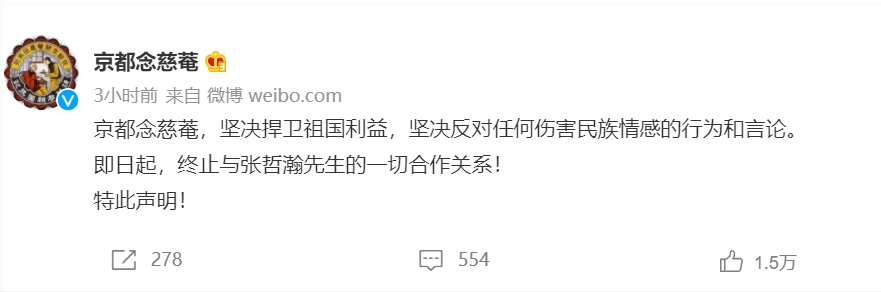 @京都念慈菴 声明:坚决捍卫祖国利益,坚决反对任何伤害民族情感的行为和言论。即日起,终止与张哲瀚先生的一切合作关系。