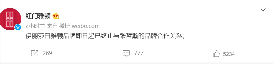 @红门雅顿 发文称,伊丽莎白雅顿品牌即日起已终止与张哲瀚的品牌合作关系。
