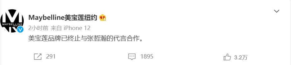 @Maybelline美宝莲纽约 发文称,美宝莲品牌已终止与张哲瀚的代言合作。