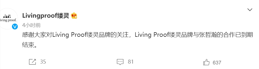 @Living Proof缕灵 声明:感谢大家对Living Proof缕灵品牌的关注,Living Proof缕灵品牌与张哲瀚的合作已到期结束。