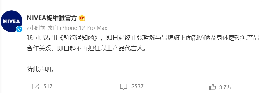 @NIVEA妮维雅官方 发文称,公司已发出《解约通知函》,即日起终止张哲瀚与品牌旗下面部防晒及身体磨砂乳产品合作关系,即日起不再担任以上产品代言人。
