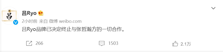@吕Ryo 发文称,吕Ryo品牌已决定终止与张哲瀚方的一切合作。