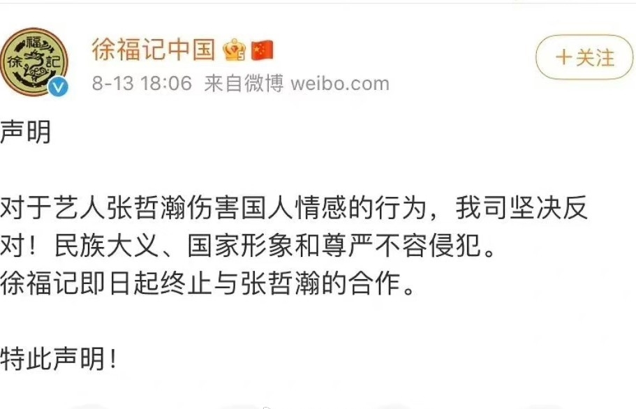 @徐福记中国 发表声明,对于艺人张哲瀚伤害国人情感的行为,我司坚决反对!民族大义、国家形象和尊严不容侵犯。徐福记即日起终止与张哲瀚的合作。
