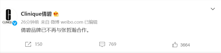 @Clinique倩碧 发文称,倩碧品牌已不再与张哲瀚合作。