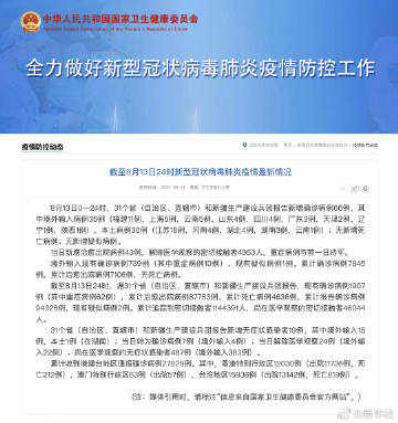 【#13日新增确诊病例66例# #13日新增本土病例30例#】据国家卫健委网站,8月13日0—24时,31个省(自治区、直辖市)和新疆生产建设兵团报告新增确诊病例66例,其中境外输入病例36例(福建11例,上海5例,云南5例,山东4例,四川4例,广东3例,天津2例,辽宁1例,陕西1例),本土病例30例(江苏18例,河南4例,湖北4例,湖南3例,云南1例);无新增死亡病例;无新增疑似病例。