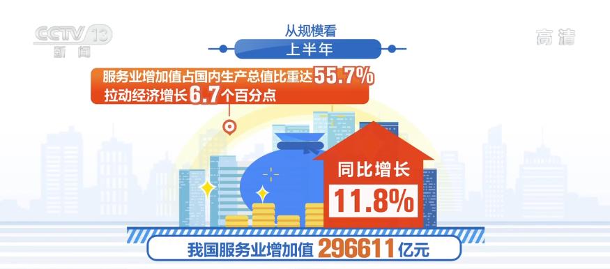 从规模看,上半年,我国服务业增加值近30万亿元(296611亿元),同比增长11.8%,服务业增加值占国内生产总值比重达55.7%,拉动经济增长6.7个百分点。