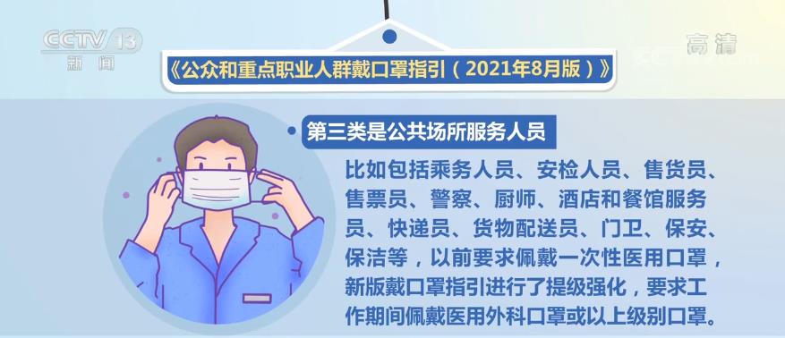 第三类是公共场所服务人员,比如包括乘务人员、安检人员、售货员、售票员、警察、厨师、酒店和餐馆服务员、快递员、货物配送员、门卫、保安、保洁等,以前要求佩戴一次性医用口罩,新版戴口罩指引进行了提级强化,要求工作期间佩戴医用外科口罩或以上级别口罩。