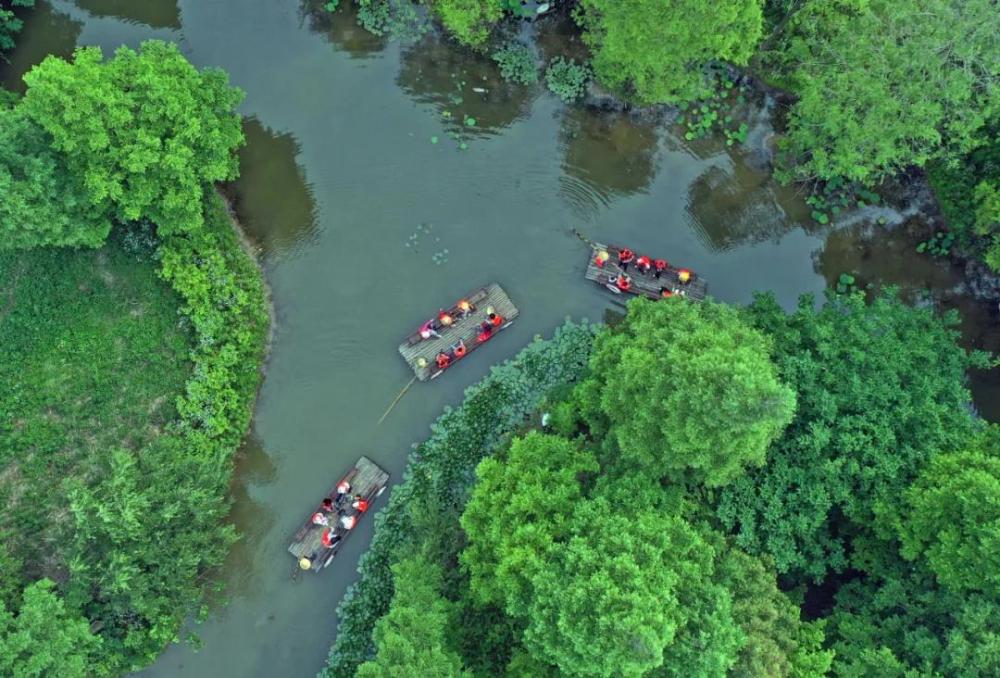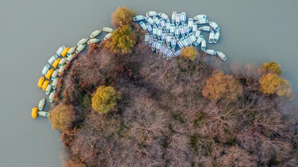 游客乘船在扬州市宝应湖国家湿地公园的水上森林游览(无人机照片)。新华社发(沈冬兵摄)
