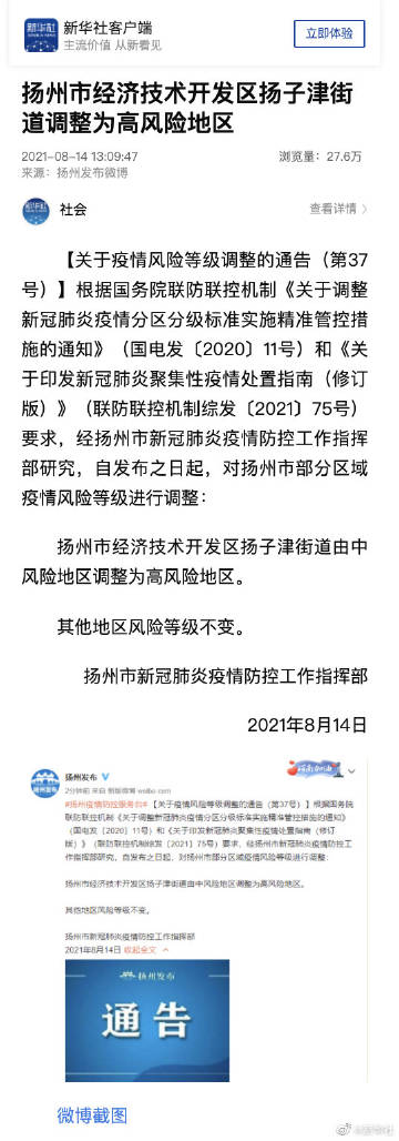 【#扬州市经济技术开发区扬子津街道调整为高风险地区#】