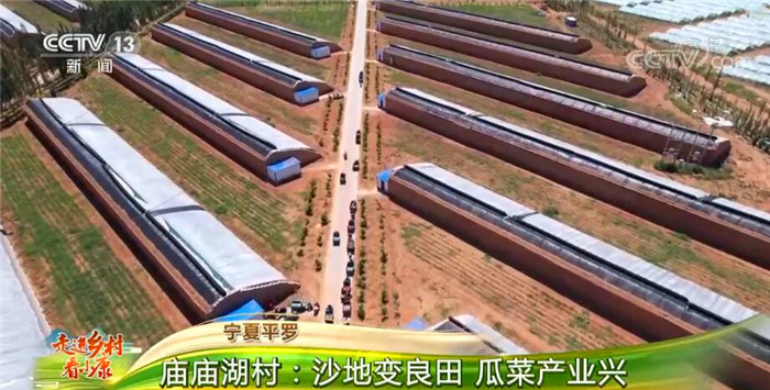 您现在看到的是宁夏石嘴山市平罗县陶乐镇的庙庙湖村。2013年,7000多名群众从西吉县搬迁到这里,当地政府引进企业,在毛乌素沙地边缘改良3万余亩沙荒地种植温棚瓜果蔬菜,逐步形成了集村庄、产业、休闲旅游、生态治理为一体的绿色生态屏障,有效解决村民的就业、增收问题。