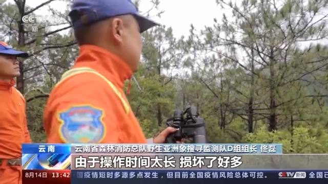 云南省森林消防总队野生亚洲象搜寻监测队D组组长 佟磊:找山上的开阔地,监测对面山上的野象,因为现在下雨天气,无人机起飞的话会受损,前段时间,无人机也是由于操作时间太长,损坏了好多。