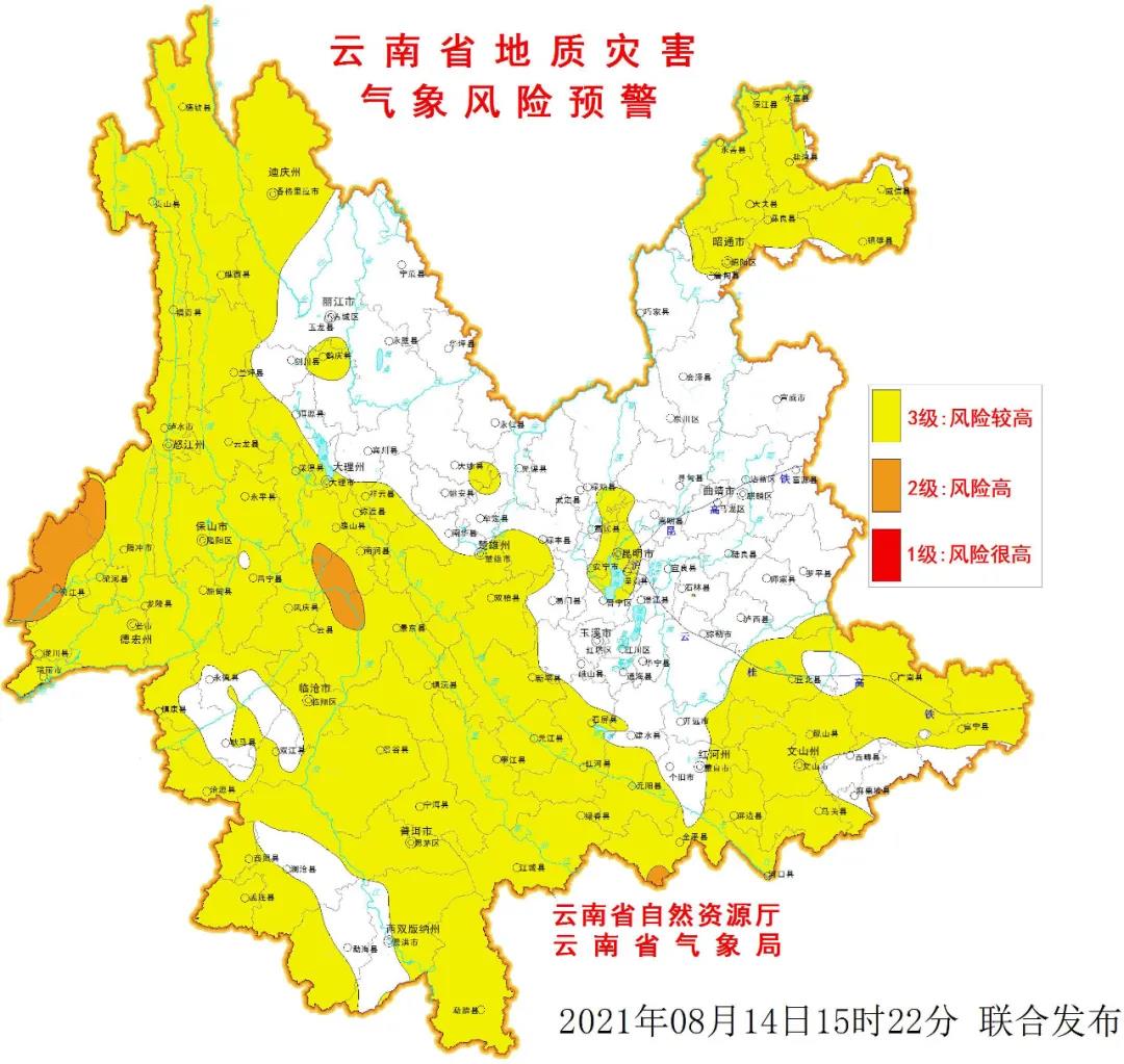 此外,预计8月14日20时—08月15日20时, 滇西北大理州局部、滇西德宏州局部、滇南红河州局部发生滑坡泥石流的风险高(橙色预警);滇东北昭通市局部、滇西北怒江州、迪庆州、丽江市、大理州局部、滇西德宏州大部、滇西南临沧市局部、滇东南普洱市局部、滇南红河州、滇东南文山州局部、滇中楚雄州、昆明市局部发生滑坡泥石流的风险较高(黄色预警)。沪昆高铁、云桂高铁沿线局部发生滑坡泥石流的风险较高。