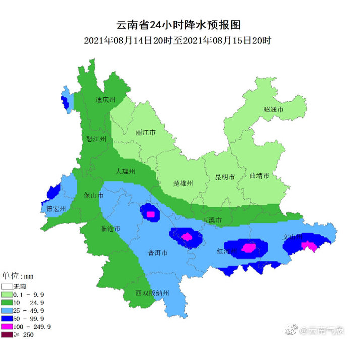 预计8月14日20时—08月15日20时:文山、红河、玉溪南部、西双版纳东部、普洱东部、临沧东部、大理南部、保山、德宏、怒江北部阴有大雨局部暴雨、大暴雨,昭通、曲靖、昆明、楚雄北部、丽江阴天间多云有小雨,其他地区阴有中雨局部大雨。