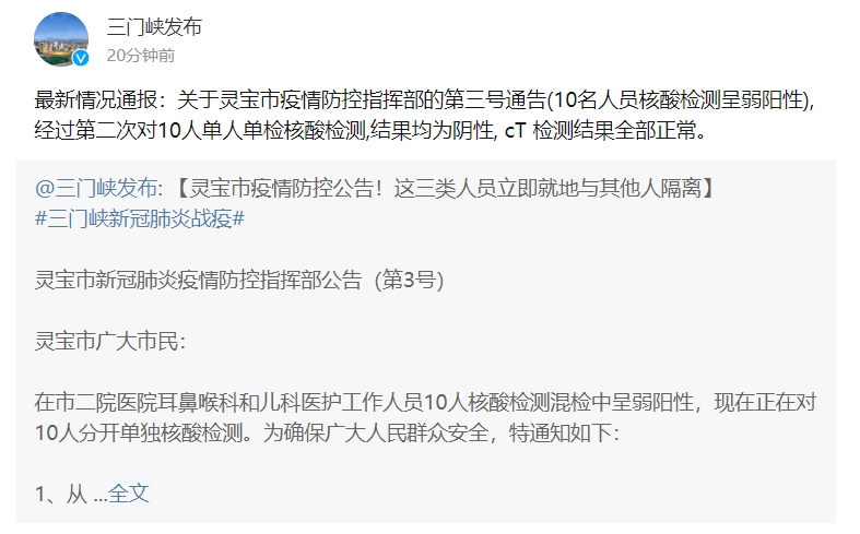据“三门峡发布”微博消息,河南三门峡灵宝市通报了今日发布的第三号通告(10名人员核酸检测呈弱阳性)的最新情况:经过第二次对10人单人单检核酸检测,结果均为阴性, CT检测结果全部正常。