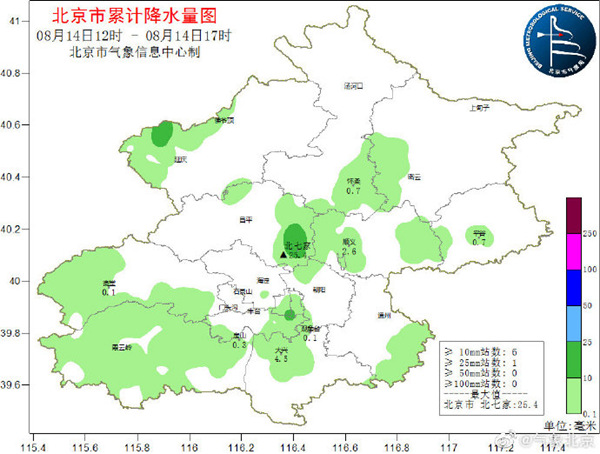 今天午后,分散性降雨在北京现身,大兴、延庆、昌平、东城、西城、房山等地部分地区雷声滚滚,雨水洒落。实况监测数据显示,12时至17时全市平均降雨量0.6毫米,城区平均降雨量0.7毫米,城区最大降水量出现在西城先农坛为19.8毫米,全市最大降雨量在昌平北七家为25.4毫米。