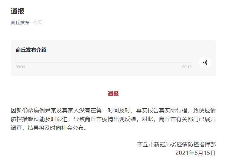 8月15日,据河南省商丘市新冠肺炎疫情防控指挥部通报,因新确诊病例尹某及其家人没有在第一时间及时、真实报告其实际行程,致使疫情防控措施没能及时跟进,导致商丘市疫情出现反弹。对此,商丘市有关部门已展开调查,结果将及时向社会公布。(总台记者 田萌)