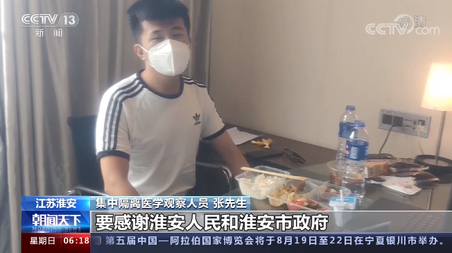 集中隔离医学观察人员 张先生:要感谢淮安人民和淮安市政府,真的让我们有一种家的感觉,然后也谢谢每天给我们送餐、量体温、做核酸的一线医务人员,这些医务人员是最勇敢的。