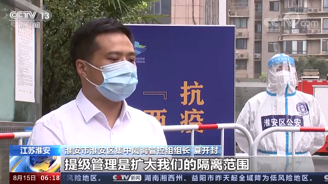 淮安市淮安区集中隔离管控组组长 夏开封:进行提级管理和提标服务,进行“双提”。提级管理是扩大我们的隔离范围,加大我们的管控措施,严格规范我们的管理流程。提标服务无论是从餐标,还是从我们医疗物资的配备,包括人性化的这种服务,对14岁以下的儿童和80岁以上的老人,我们都逐一进行了一个咨询。