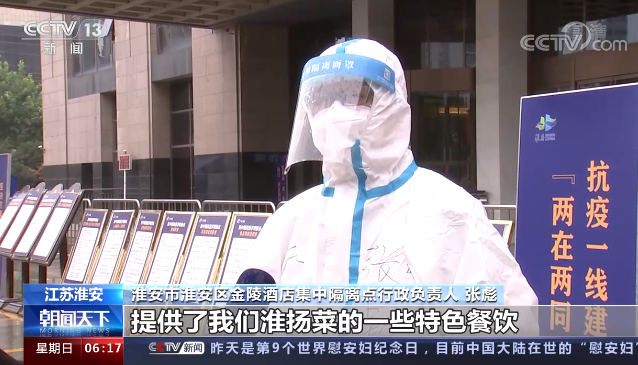 淮安市淮安区金陵酒店集中隔离点行政负责人 张彪:用餐方面,提供了我们淮扬菜的一些特色餐饮,比如软兜长鱼、钦工肉圆等,另外我们还提供了一些小食,比如淮安茶馓。在保障消杀方面,我们做到隔离区域一天三消杀,高污染区域一天两消杀,工作区域一天一消杀。
