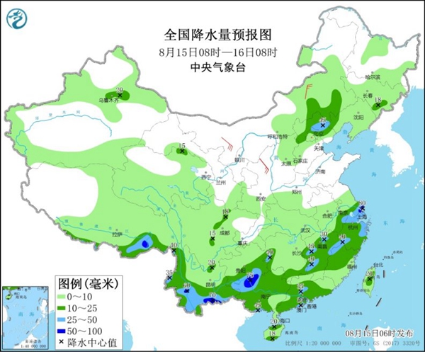 今明天(8月15日至16日),贵州至长江中下游一带的降雨将呈现减弱的趋势,但在江南东部、广西、云南等地仍将有明显降雨,局地有暴雨,同时,在华北、东北地区南部也将有雨水现身。在雨水打压下,江淮、江汉、江南北部等地气温偏低,而华南等地闷热持续,西北地区东部干晒晴热在线。