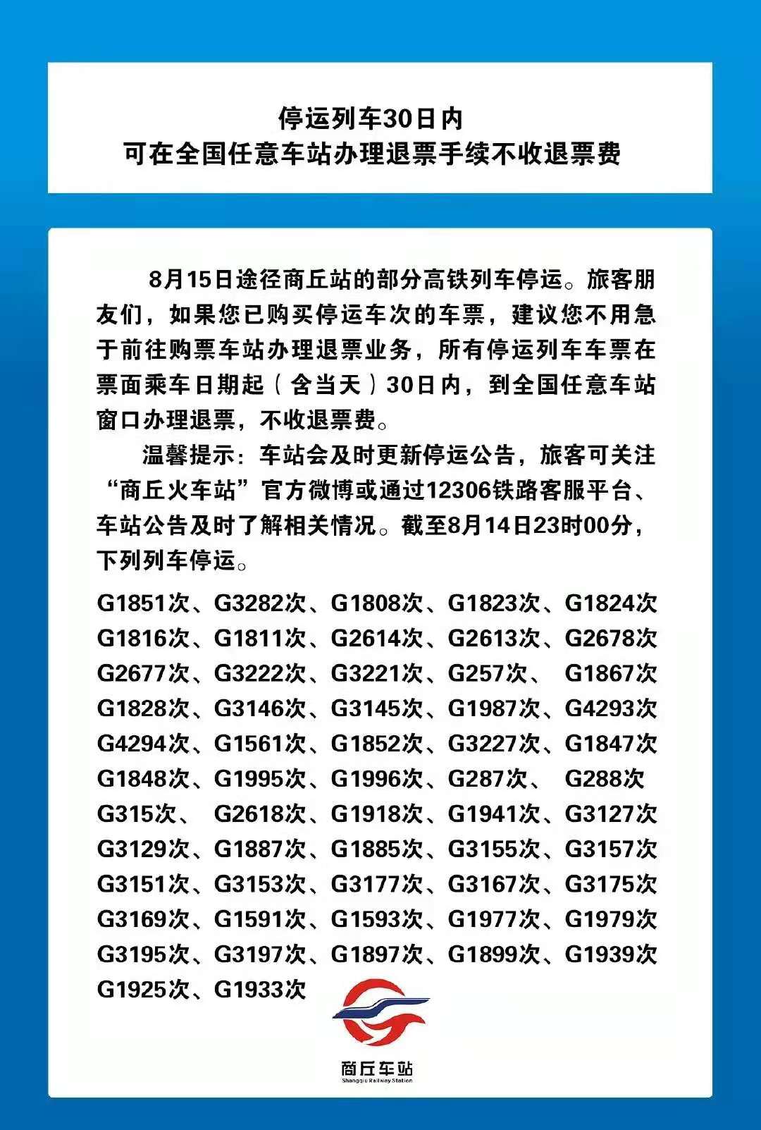受疫情和水害影响,8月15日途经河南省商丘站的部分高铁列车停运,商丘车站发布公告称若乘客已购买停运车次车票,不用急于前往购票车站办理退票,所有停运列车车票在票面乘车日期起(含当天)30日之内,到全国任意车站窗口办理退票,不收退票费。具体信息如下: