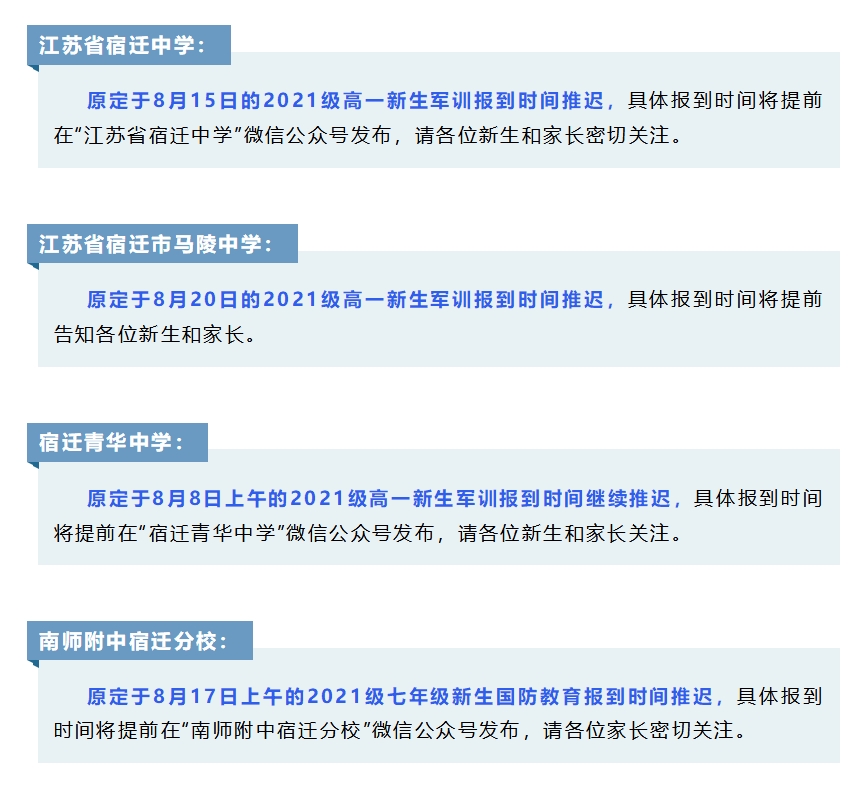 由于防疫需要,江苏宿迁多所学校发布通知,将军训安排延期,具体开训时间另行通知,详情如下图: