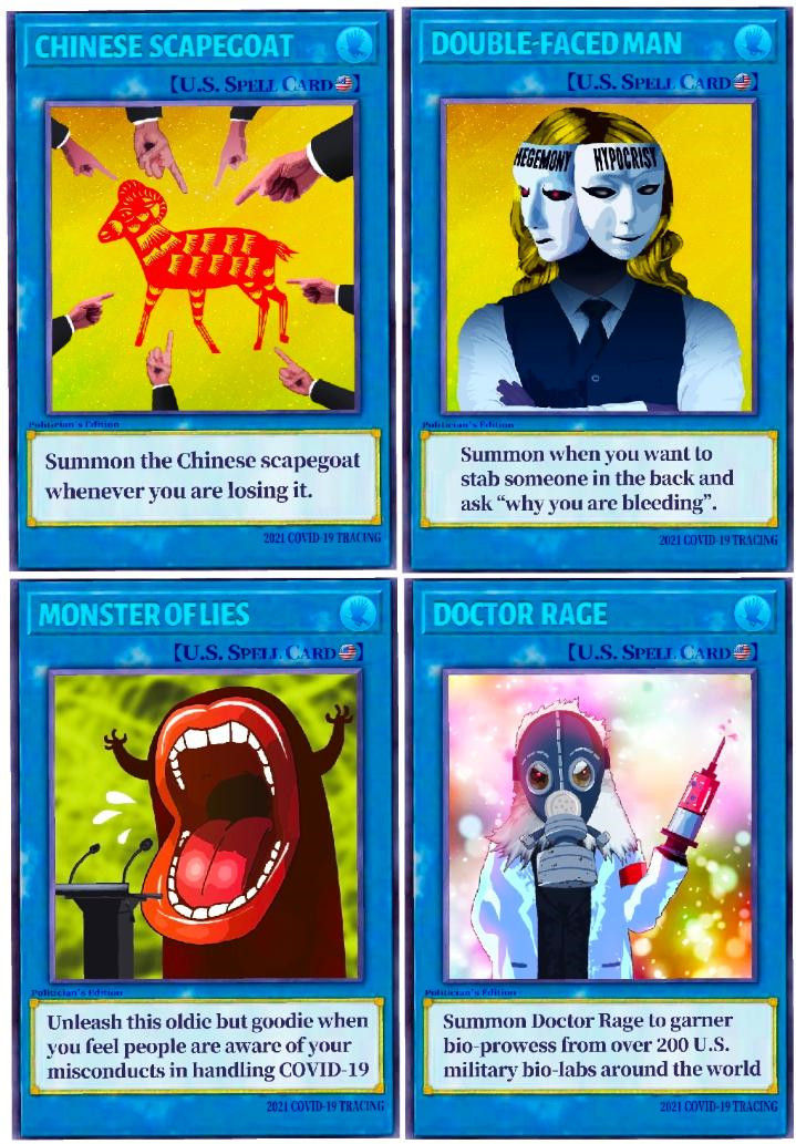 令海外网友大呼过瘾的还有这些“游戏王”风格的卡牌:召唤“中国替罪羊”为抗疫失败找借口;召唤“双面人”发起抹黑攻击;召唤“谎言兽”回应质疑之声;召唤“愤怒的生化博士”统领美国遍布全球的生化实验室……