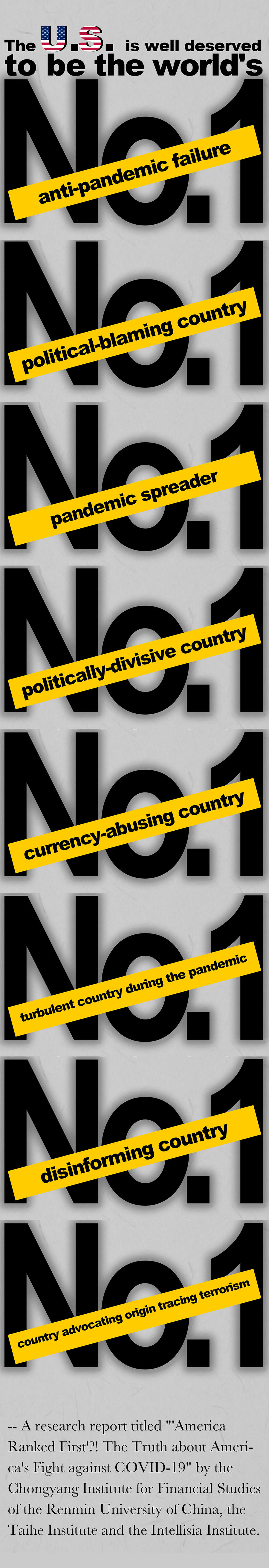 全球第一抗疫失败国、全球第一政治甩锅国、全球第一疫情扩散国、全球第一政治撕裂国、全球第一货币滥发国、全球第一疫期动荡国、全球第一虚假信息国、全球第一溯源恐怖主义国。