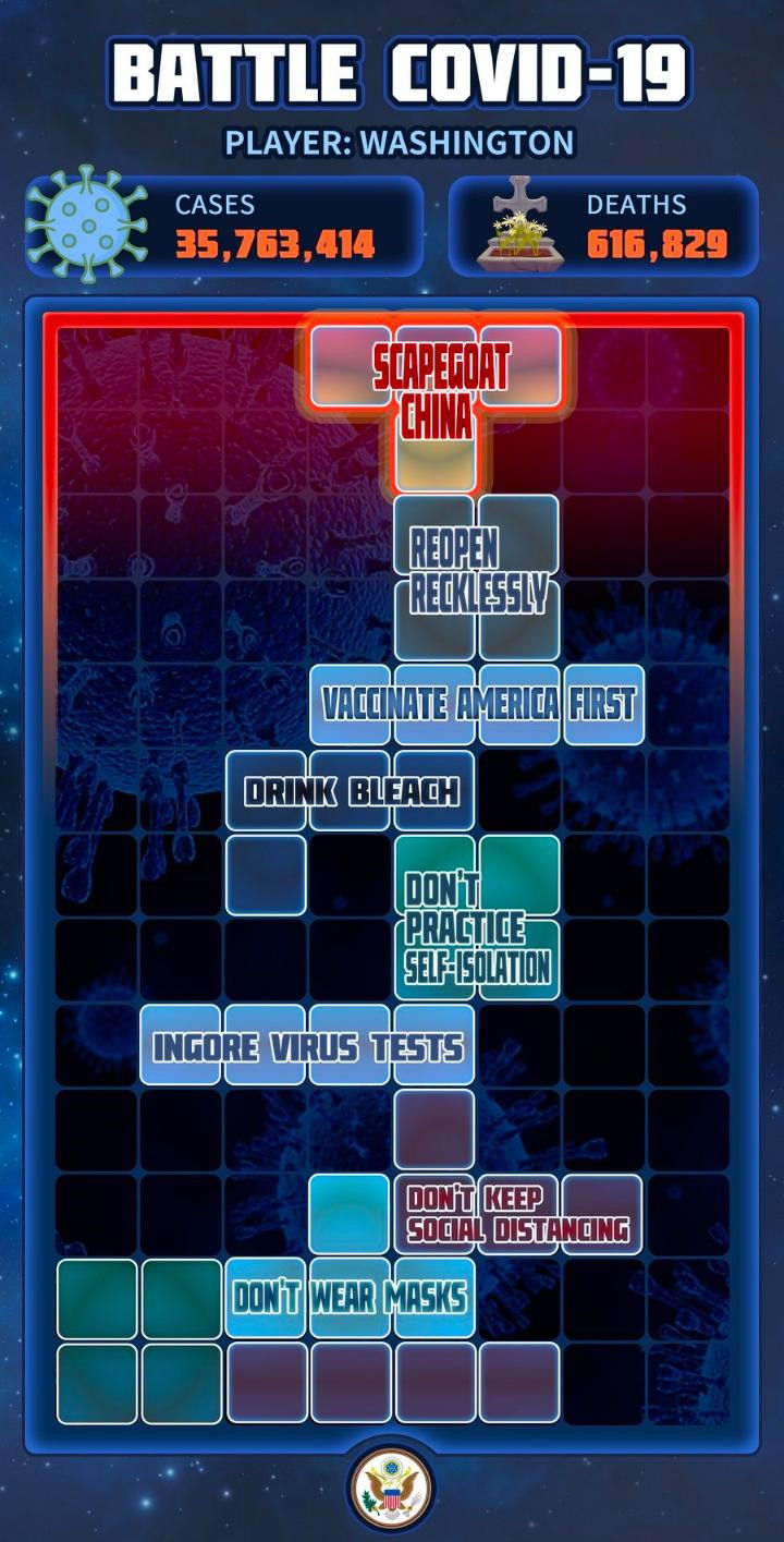 除了政治讽刺漫画,“漫天过海特工队”还大开脑洞,创作游戏主题海报,比如用俄罗斯方块图解美国抗疫不力的种种原因:
