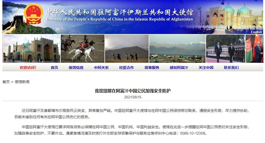 中国驻阿富汗大使馆已要求阿各派务必保障在阿中国公民、中国机构、中国利益安全。使馆在此进一步提醒在阿中国公民密切关注安全形势,加强自身安全防护,不要外出。遇紧急情况请及时拨打外交部全球领事保护与服务应急呼叫中心电话:0086-10-12308。