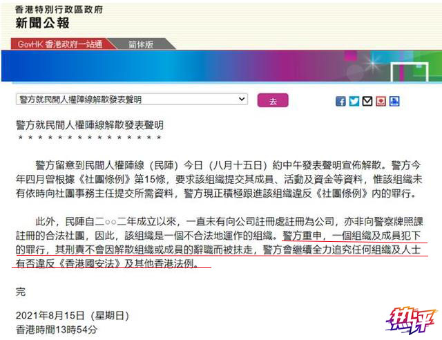 继“教协”8月10日宣布“自我了断”后,反中乱港势力的又一个组织“民阵”今天宣布解散。